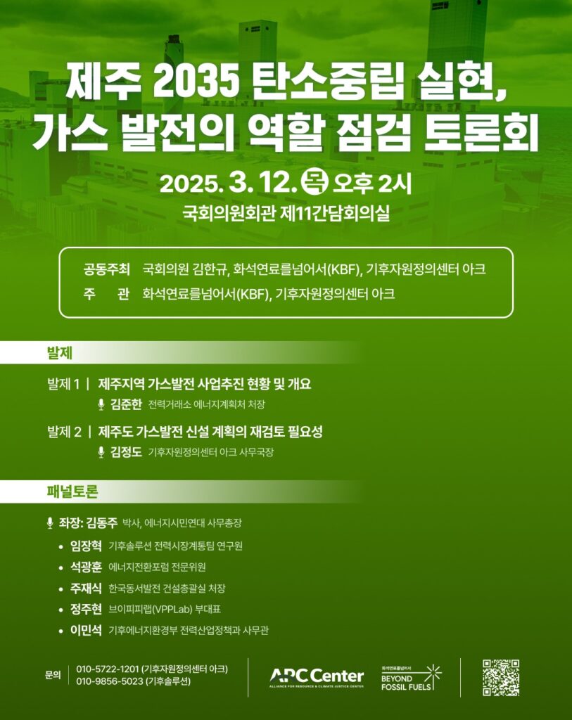 On March 12, National Assembly Member Kim Han-kyu, Beyond Fossil Fuels, and the Climate and Resource Justice Center ARC will host a seminar to evaluate the role of gas power in achieving Jeju’s 2035 Carbon Neutrality.